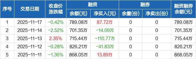 融资方面,当日融资买入273.21万元,融资偿还185.49万元,融资净买入87.72万元。融券方面,融券卖出0份,融券偿还0份,融券余量0份,融券余额0元。融资融券余额合计789.08万元。