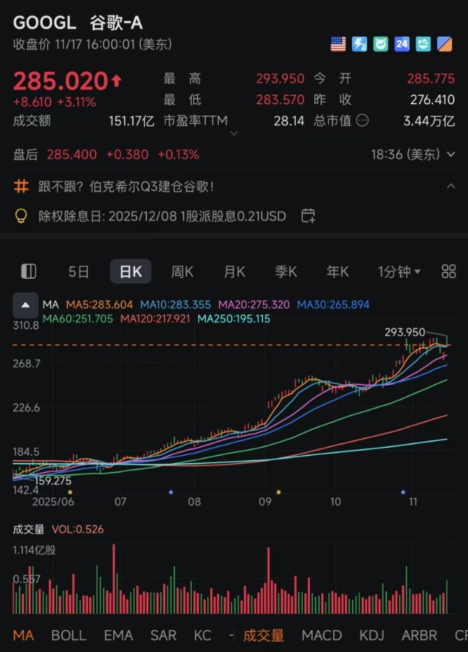 谷歌逆势收涨3%,盘中涨幅一度超过6%。此前,巴菲特旗下伯克希尔·哈撒韦首次建仓谷歌A类股,谷歌也成为了伯克希尔的第十大重仓股。