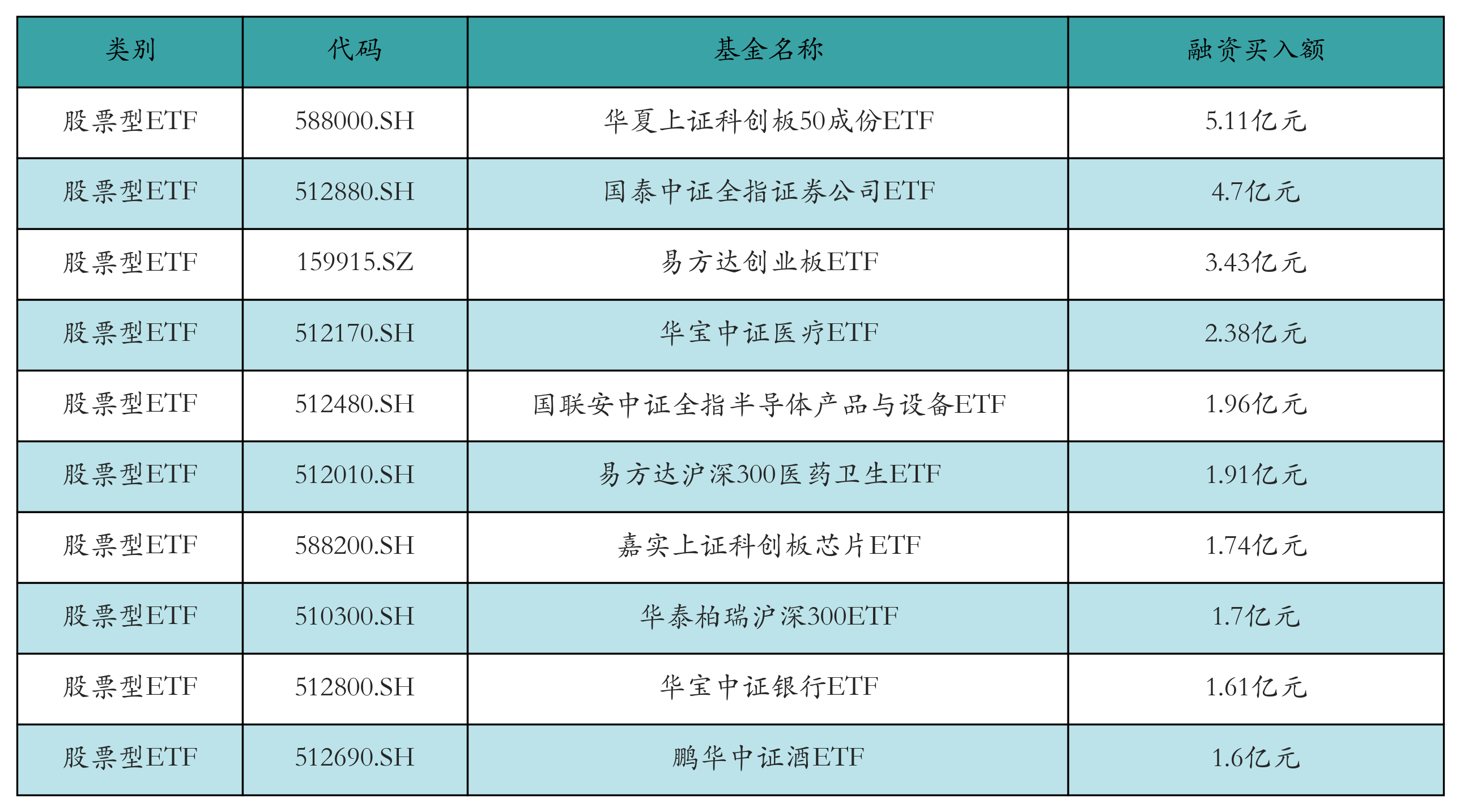昨日股票型ETF融资买入额最高的3只ETF及其买入金额分别为:华夏上证科创板50成份ETF(5.11亿元)、国泰中证全指证券公司ETF(4.7亿元)、易方达创业板ETF(3.43亿元)。融资买入额前10详情见下表: