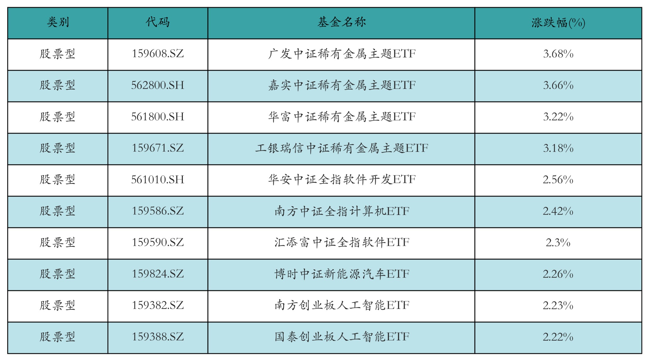 昨日股票型ETF涨幅最高的3只ETF及其收益率分别为:广发中证稀有金属主题ETF(3.68%)、嘉实中证稀有金属主题ETF(3.66%)、华富中证稀有金属主题ETF(3.22%)。涨幅前10详情见下表: