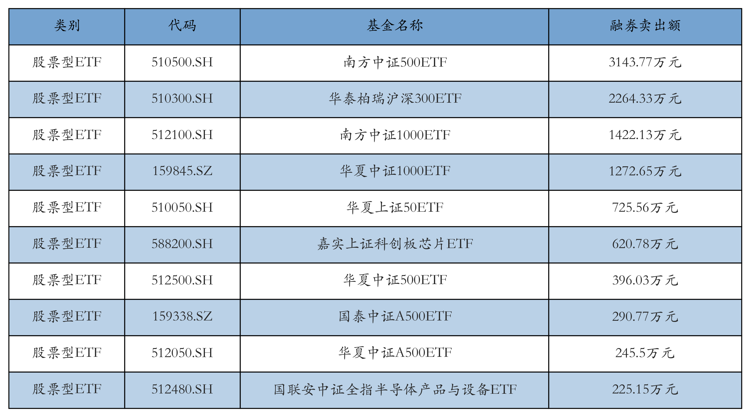 昨日股票型ETF融资卖出额最高的3只ETF及其卖出金额分别为:南方中证500ETF(3143.77万元)、华泰柏瑞沪深300ETF(2264.33万元)、南方中证1000ETF(1422.13万元)。融券卖出额前10详情见下表: