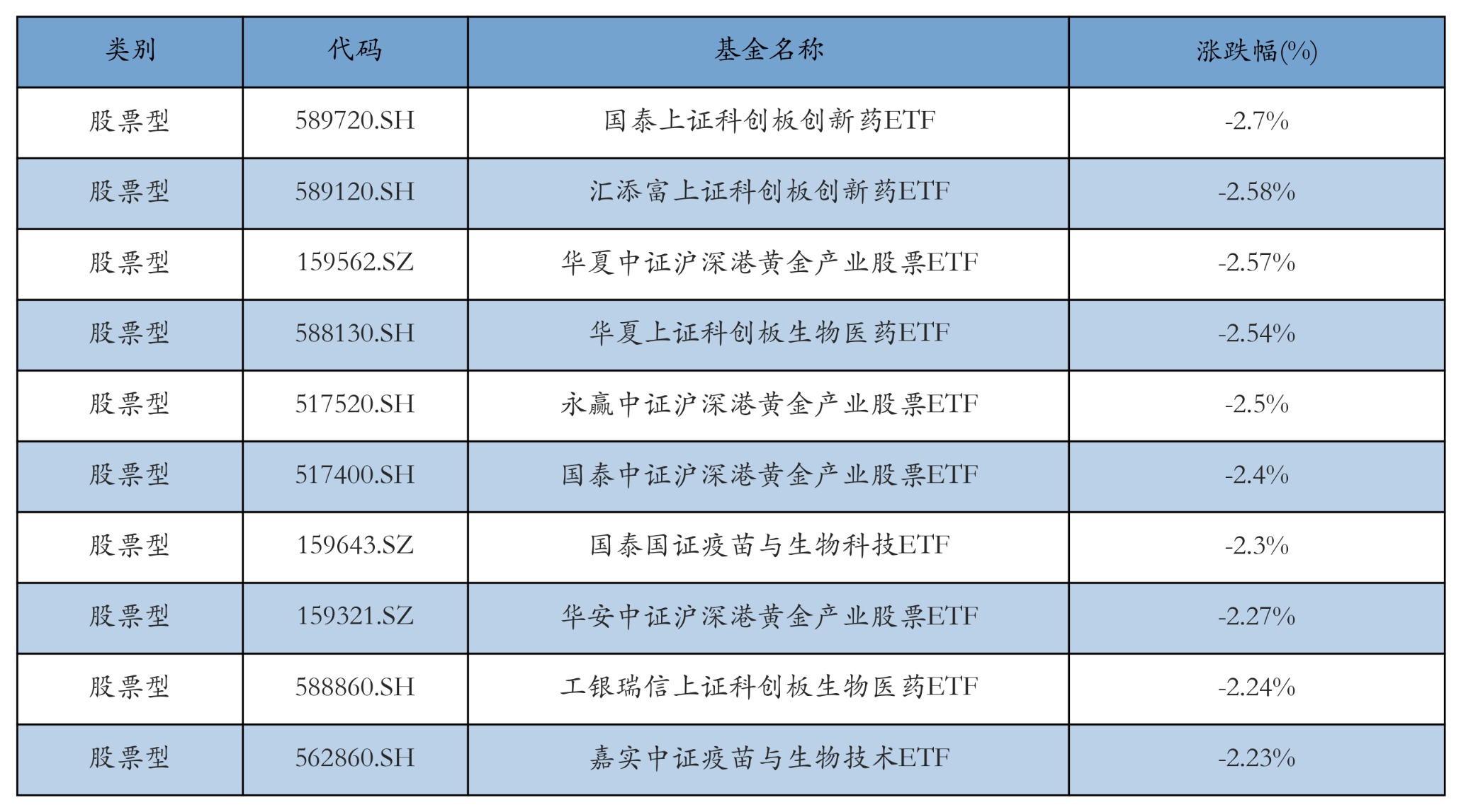 昨日股票型ETF跌幅最大的3只ETF及其收益率分别为:国泰上证科创板创新药ETF(-2.7%)、汇添富上证科创板创新药ETF(-2.58%)、华夏中证沪深港黄金产业股票ETF(-2.57%)。跌幅前10详情见下表: