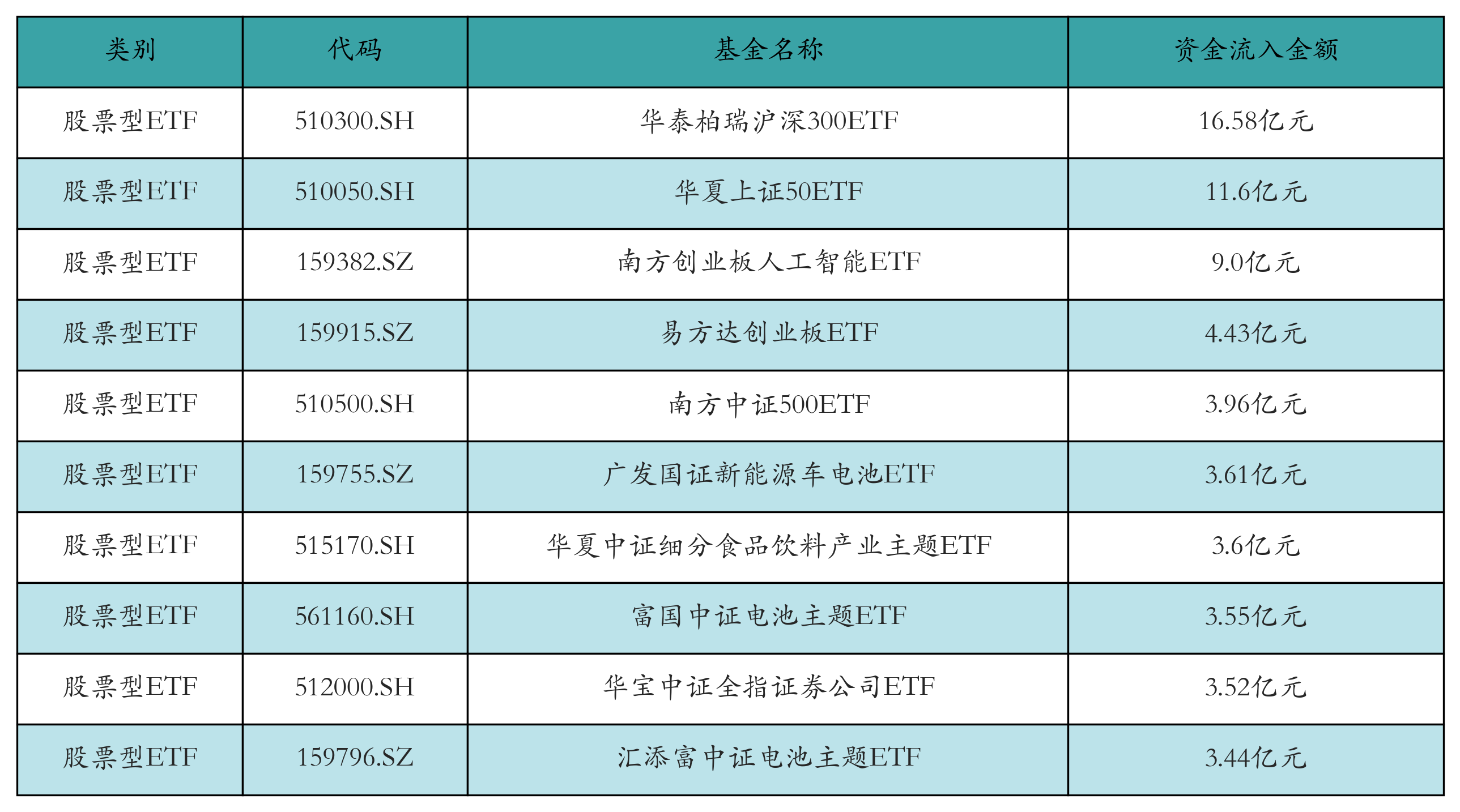 昨日股票型ETF资金流入最多的3只ETF及其流入金额分别为:华泰柏瑞沪深300ETF(流入16.58亿元)、华夏上证50ETF(流入11.6亿元)、南方创业板人工智能ETF(流入9.0亿元)。资金流入前10详情见下表: