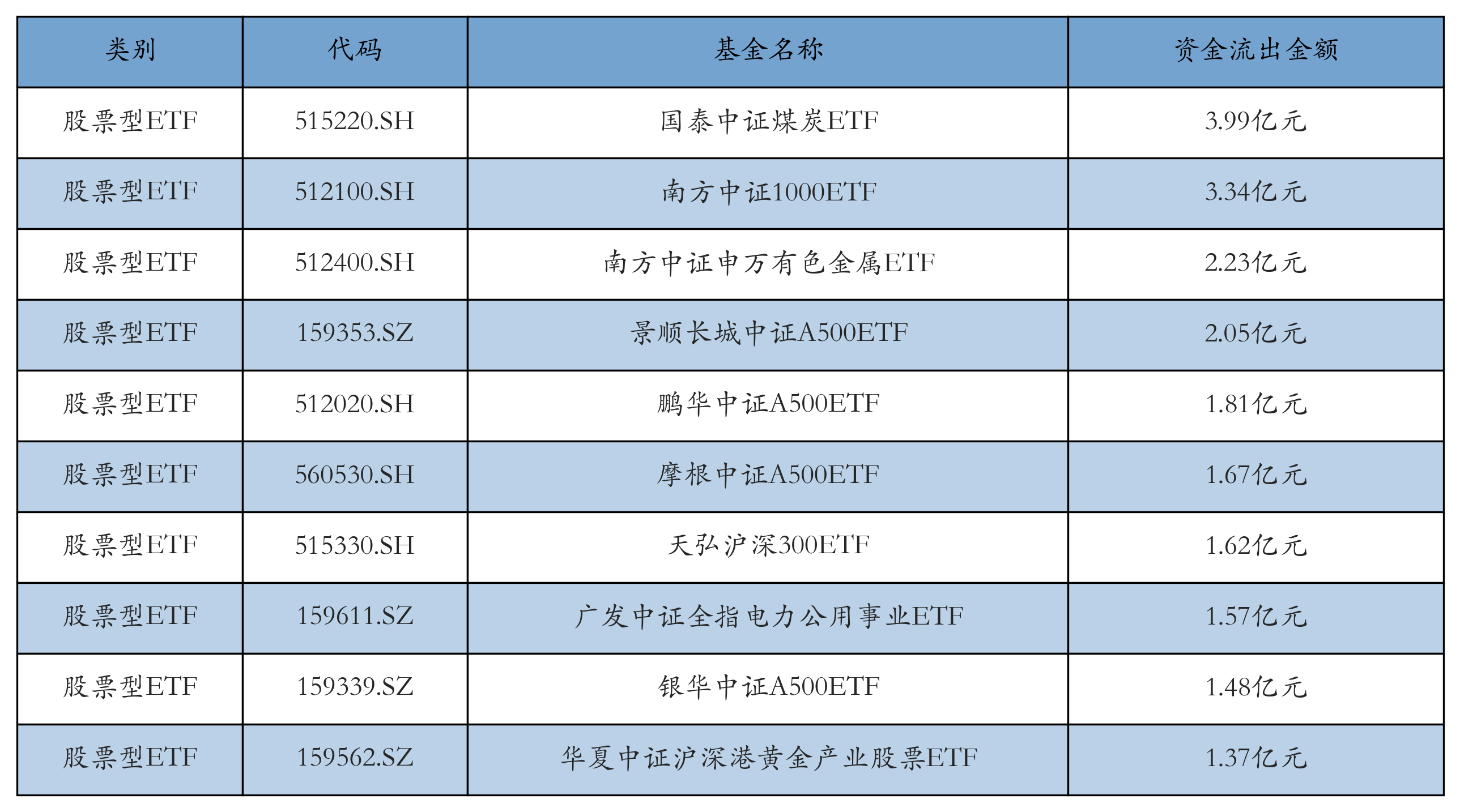 昨日股票型ETF资金流出最多的3只ETF及其流出金额分别为:国泰中证煤炭ETF(流出3.99亿元)、南方中证1000ETF(流出3.34亿元)、南方中证申万有色金属ETF(流出2.23亿元)。资金流出前10详情见下表: