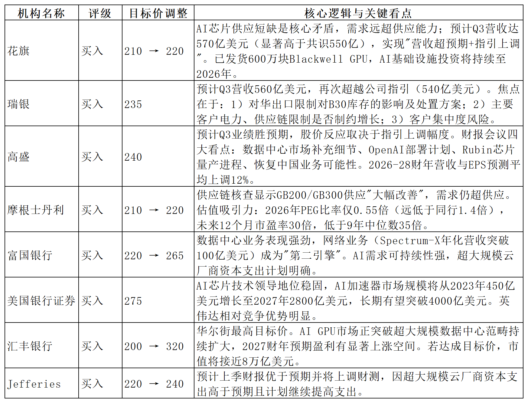 尽管市场存在“理性泡沫”的讨论,且桥水基金、软银等顶级投资者有所减仓,但主流机构观点普遍较为积极。但主流机构观点更为积极。Wedbush强调,本次财报及指引将是推翻“AI泡沫论”的关键。