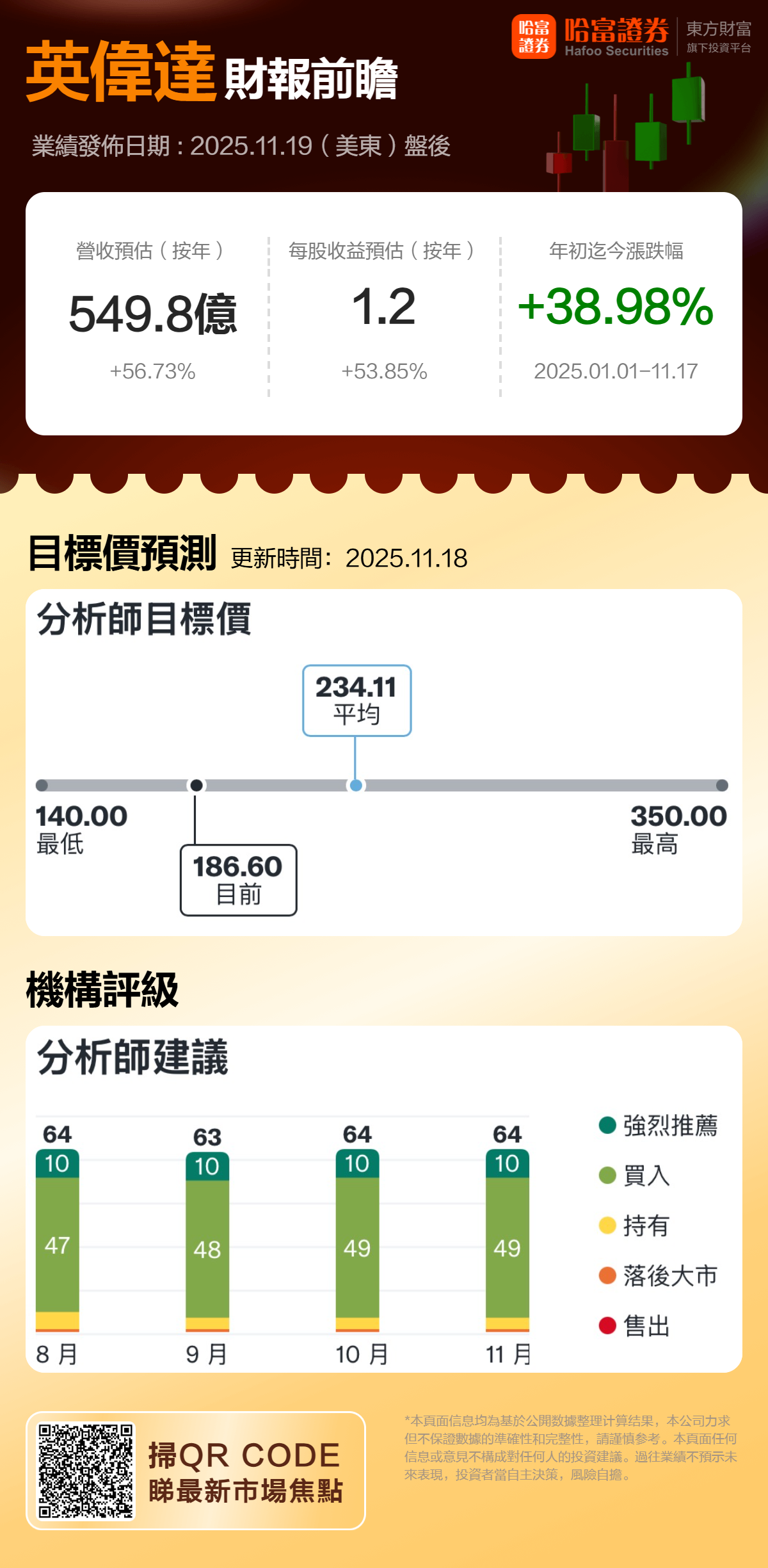 英伟达将于美东时间11月19日盘后发布财报,2026财年第三季度预计实现营收549.8亿美元,同比增加56.73%;预期每股收益1.2美元,同比增加53.85%。(上述数据使用的会计准则为US-GAAP)