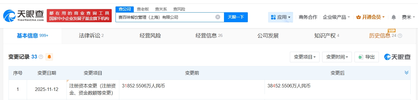 赛百味上海餐饮管理公司增资至3.8亿