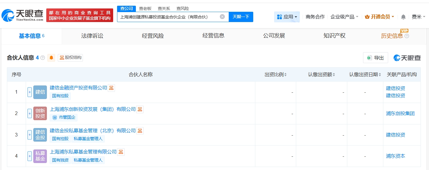 每经AI快讯,天眼查工商信息显示,近日,上海浦创建源私募投资基金合伙企业(有限合伙)成立,执行事务合伙人为建信金投私募基金管理(北京)有限公司,出资额33.34亿元人民币,经营范围为以私募基金从事股权投资、投资管理、资产管理等活动。合伙人信息显示,该基金由建信金融资产投资有限公司、上海浦东创新投资发展(集团)有限公司、建信金投私募基金管理(北京)有限公司、上海浦东私募基金管理有限公司共同出资。