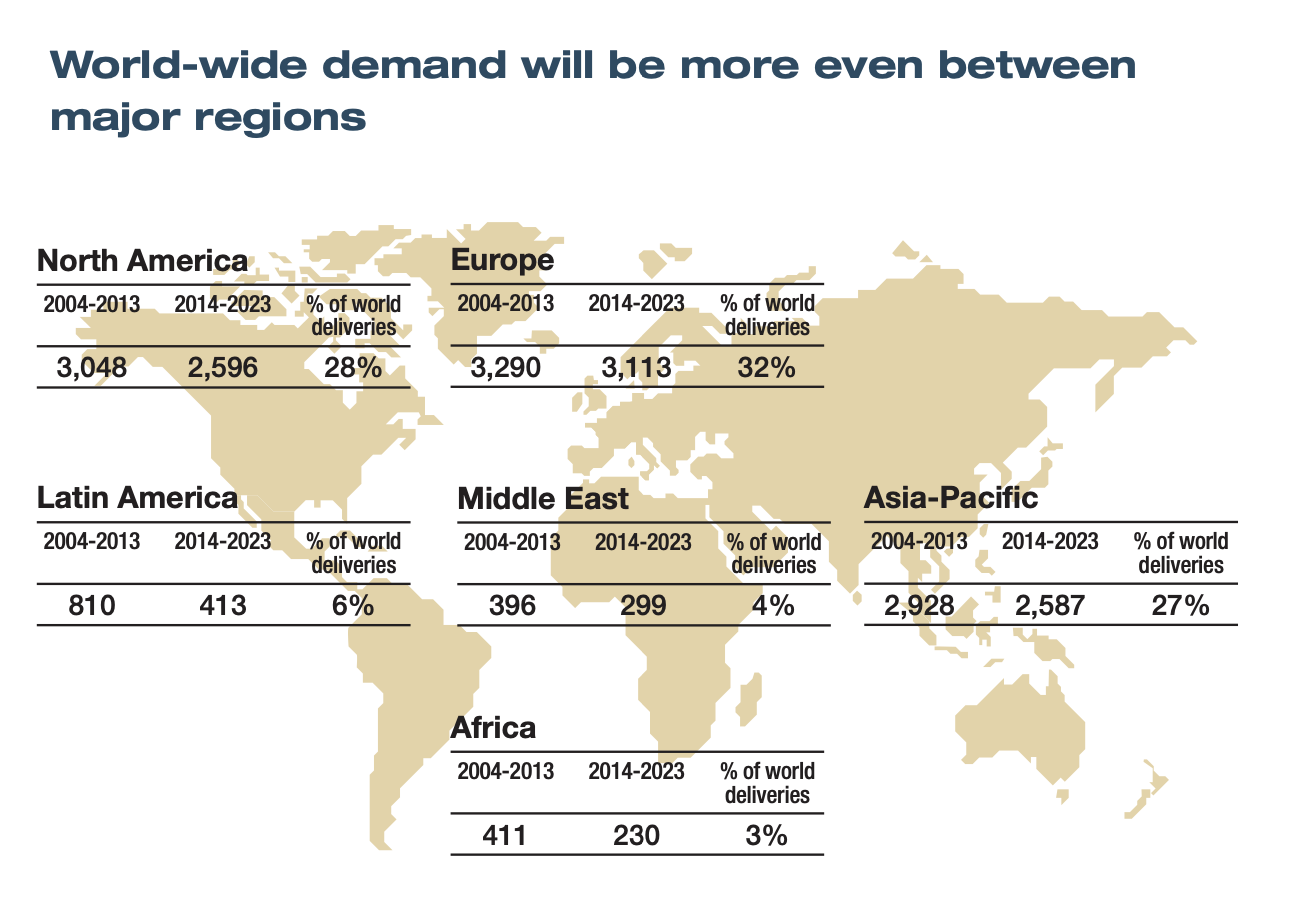 在空客的调研下,亚太地区在2004至2023年期间的发展被给予极高厚望。空客预测其市场规模将占全球27%,仅次于当时民航体系已经成熟的欧洲与北美地区。