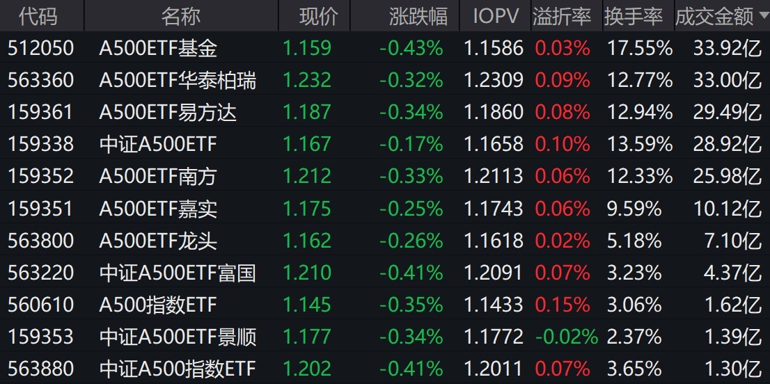 截至上午收盘,场内跟踪中证A500指数的ETF小幅下跌。其中,有11只中证A500相关ETF成交额超1亿元,3只超29亿元。A500ETF基金、A500ETF华泰柏瑞、A500ETF易方达早盘成交额分别为33.92亿元、33亿元、29.49亿元。