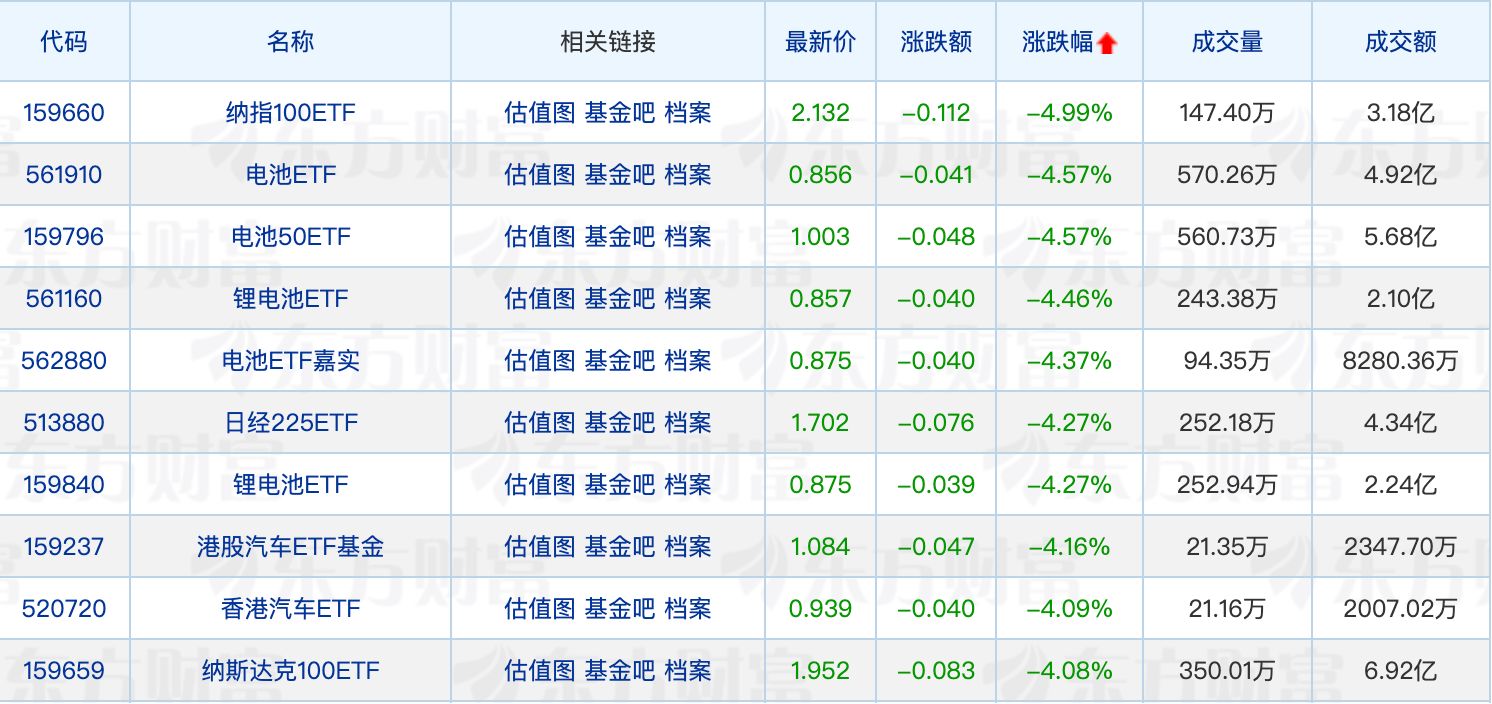 下跌方面,纳指100ETF领跌4.99%。锂电池板块震荡走弱,石大胜华跌停,电池相关ETF全线回调。