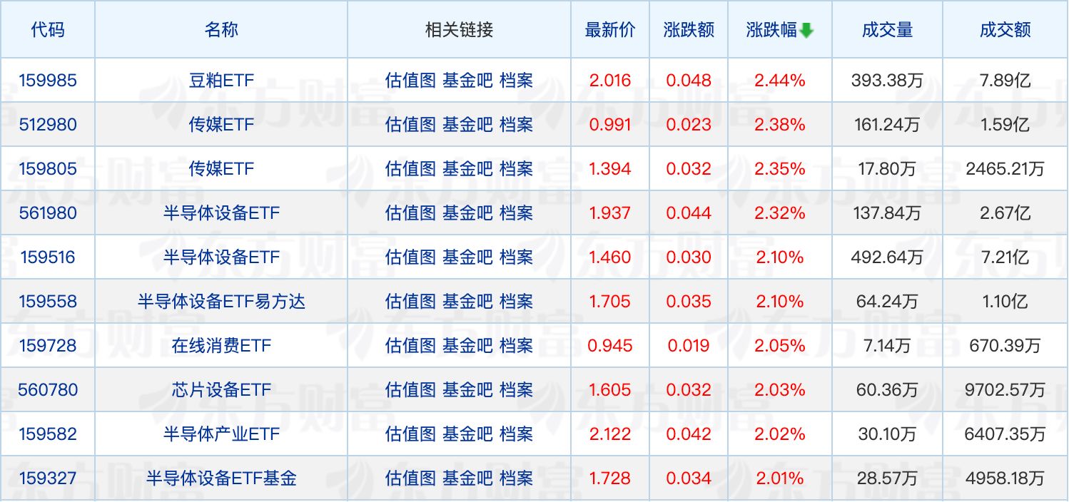 具体来看,豆粕ETF领涨2.44%。半导体概念表现活跃,圣晖集成、龙迅股份涨停,多只半导体设备ETF走强。