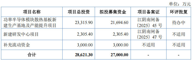 根据招股书,赛英电子此次IPO拟发行1080万股,募集资金2.7亿元,计划用于功率半导体模块散热基板新建生产基地及产能提升项目、新建研发中心项目和补充流动资金。