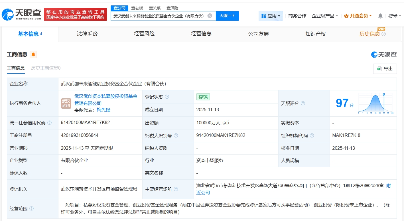 南方财经11月18日电,天眼查工商信息显示,近日,武汉武创未来智能创业投资基金合伙企业(有限合伙)成立,出资额10亿人民币,经营范围为私募股权投资基金管理、创业投资基金管理服务、创业投资。合伙人信息显示,该基金由湖北省人形机器人产业投资基金合伙企业(有限合伙)、武汉创新投资集团有限公司、武汉产业发展基金有限公司、武汉武创资本私募股权投资基金管理有限公司共同出资。