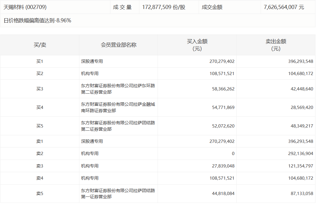 天赐材料今日跌停 三机构合计净卖出3.82亿元