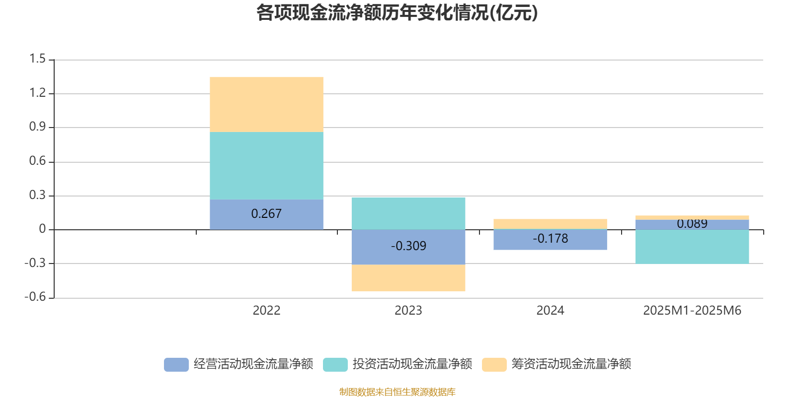 2025年1月至6月,公司经营活动现金流净额为888.4万元,同比增长48.09%;筹资活动现金流净额355.4万元,同比减少2571.1万元;投资活动现金流净额-3016.6万元,上年同期为-341.5万元。