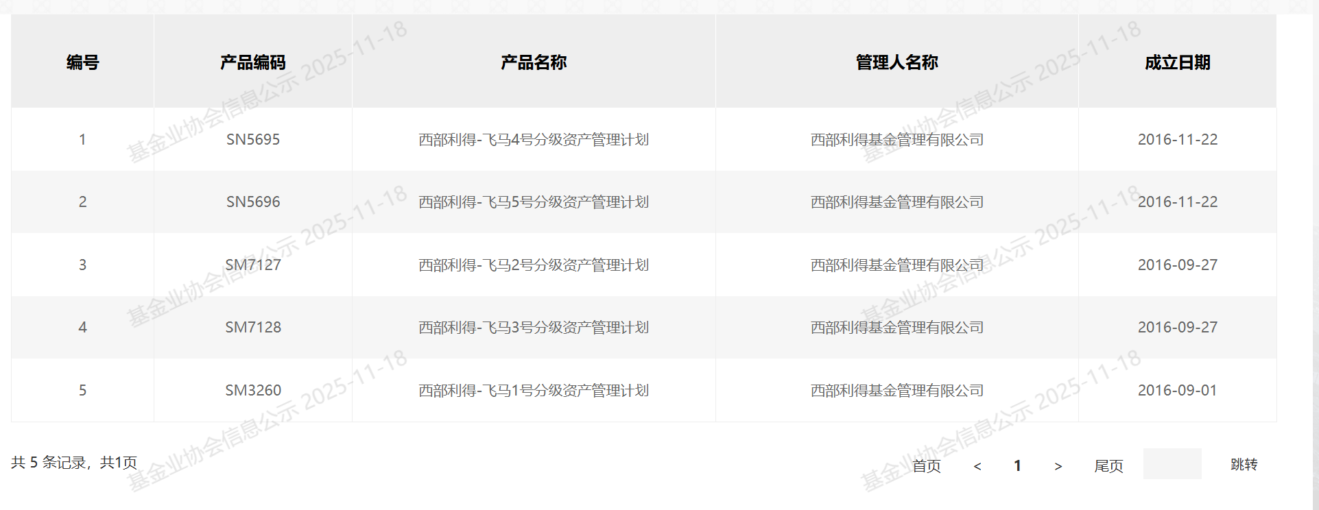 早在2016年9月份-11月份,西部利得基金先后发行了5只飞马分级资管计划,托管人均为浦发银行,每只资管计划的产品期限皆为2年,合计发行规模15亿元,合计投资者数量563人。协会数据显示,这些资管计划均属于固定收益类资产,目前已经清算。