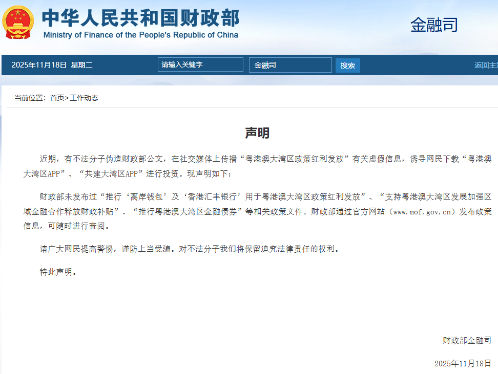 近期,有不法分子伪造财政部公文,在社交媒体上传播“粤港澳大湾区政策红利发放”有关虚假信息,诱导网民下载“粤港澳大湾区APP”“共建大湾区APP”进行投资。现声明如下: