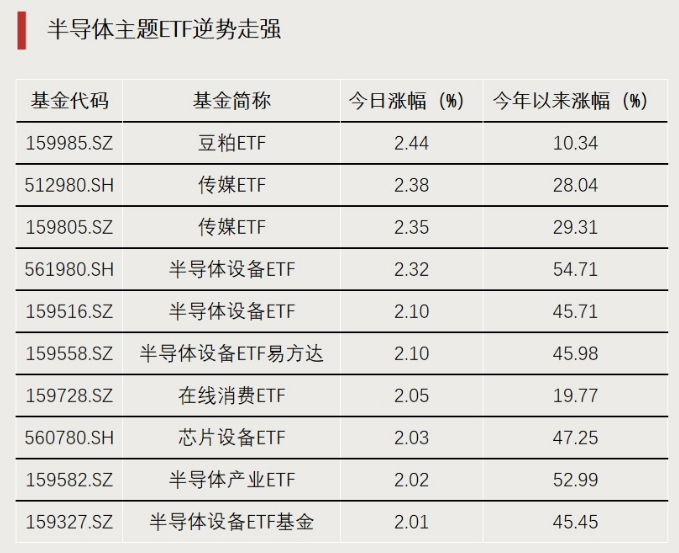 市场整体回调,半导体主题ETF逆势走强,多只产品涨超2%,跻身涨幅榜前十。豆粕期货、传媒股等相关ETF表现相对亮眼。