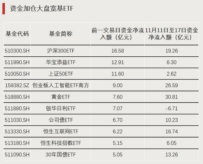 前一交易日(11月17日),ETF资金净流入超170亿元,净流入超10亿元的ETF中,除了一只货基产品,其余两只均为宽基ETF。