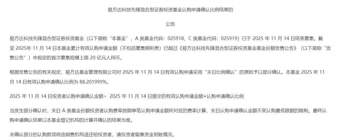 11月18日,易方达基金公告称,截至11月14日,易方达科技先锋混合基金累计有效认购申请金额(不包括募集期利息)已超过首次募集规模上限20亿元。对11月14日有效认购申请采用“末日比例确认”的原则予以部分确认,有效认购申请确认比例为88.2%。