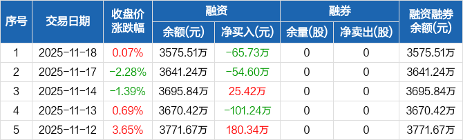融资方面,当日融资买入275.51万元,融资偿还341.24万元,融资净偿还65.73万元。融券方面,融券卖出0股,融券偿还0股,融券余量0股,融券余额0元。融资融券余额合计3575.51万元。