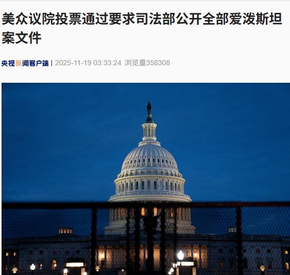 当日稍早前,美国国会众议院表决并通过了一份法案,要求美国司法部公开全部爱泼斯坦案文件