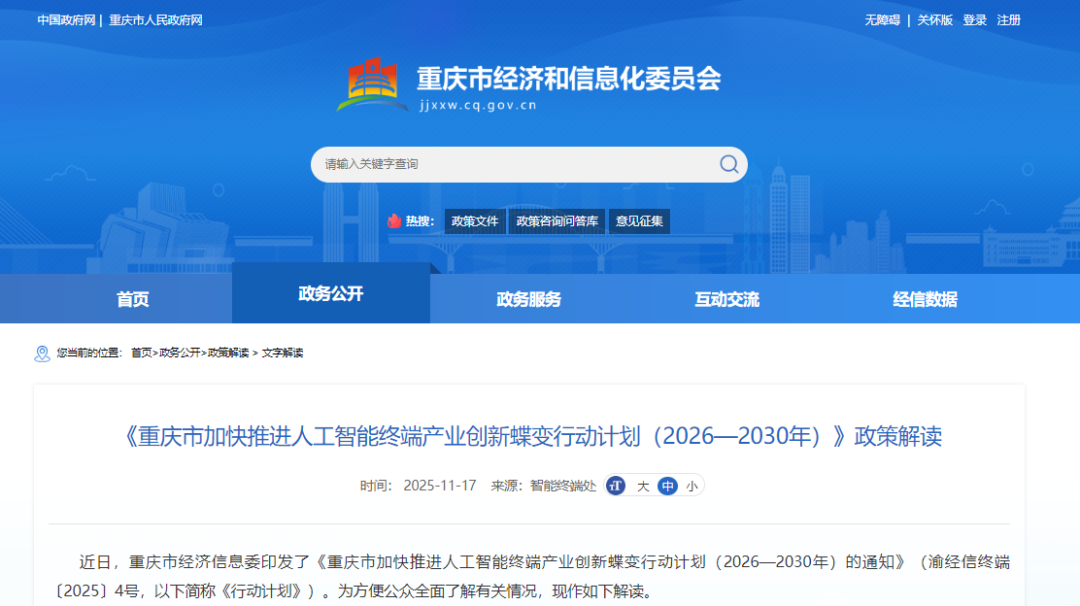 近日,重庆市经济信息委印发了《重庆市加快推进人工智能终端产业创新蝶变行动计划(2026—2030年)的通知》(渝经信终端〔2025〕4号,以下简称《行动计划》)。