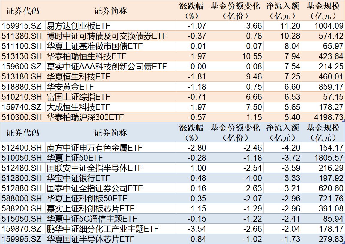 ETF规模速报 | 创业板ETF净流入超11亿元,有色金属ETF净流出超4亿元