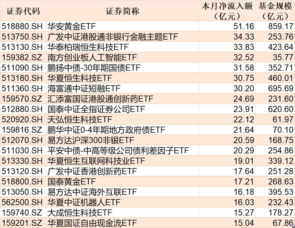 截至11月18日,本月资金净流入额居前20的ETF名单如下: