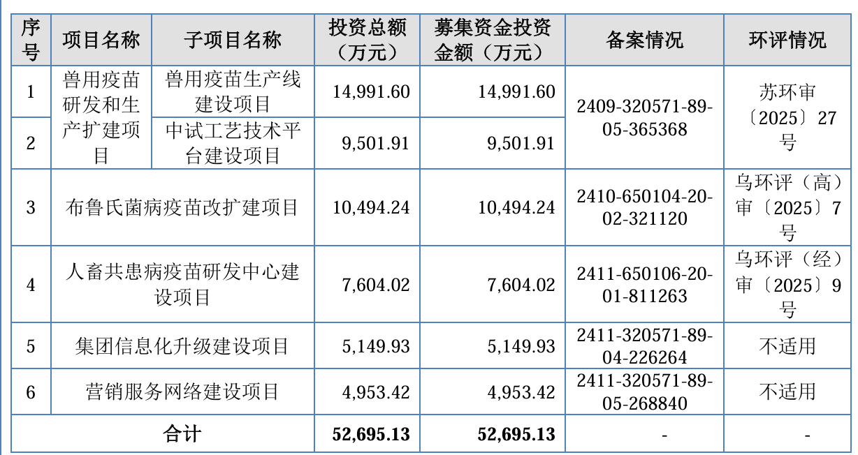 招股书显示,天康制药本次IPO拟募集资金5.27亿元,其中兽用疫苗研发和生产扩建项目募资1.28亿元,布鲁氏菌病疫苗改扩建项目募资1.05亿元。