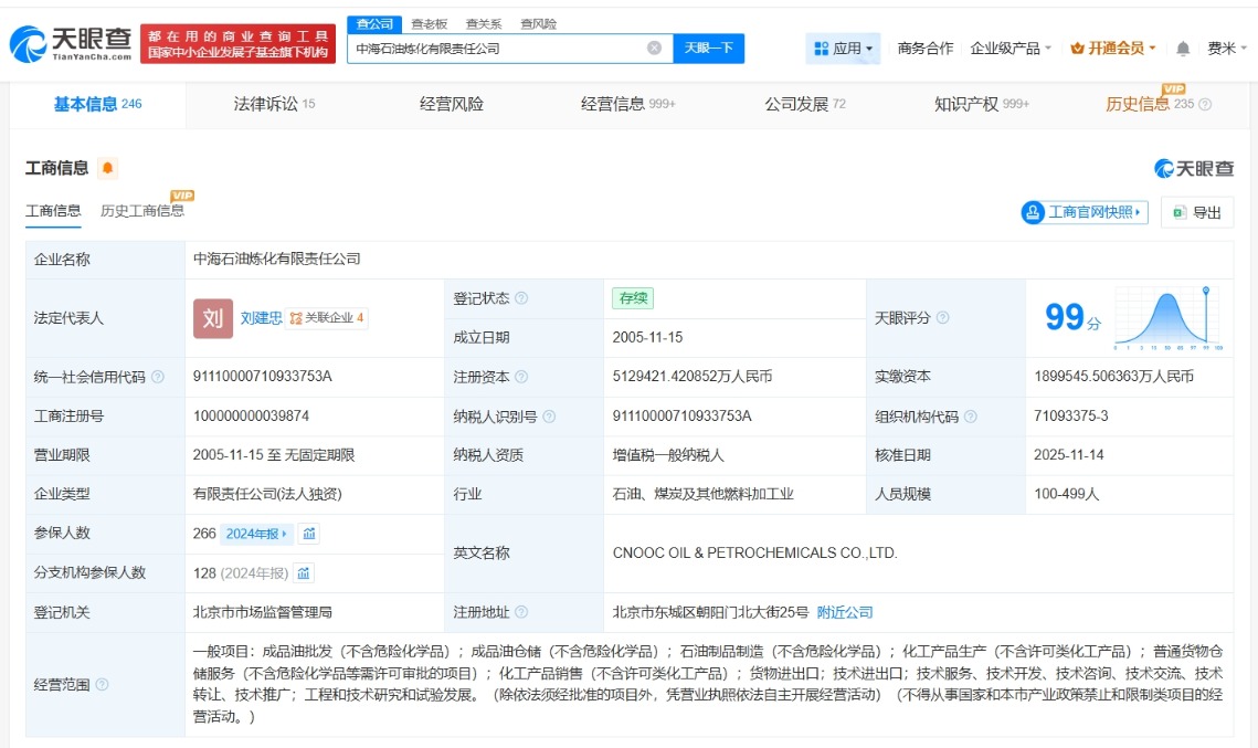 每经AI快讯,天眼查工商信息显示,近日,中海石油炼化有限责任公司发生工商变更,注册资本由约189.95亿元人民币增至约512.94亿元人民币,增幅约170%,佘浩滨卸任该公司法定代表人,由刘建忠接任,同时部分主要人员发生变更。中海石油炼化有限责任公司成立于2005年11月,经营范围含成品油批发、成品油仓储、石油制品制造、化工产品生产等。股东信息显示,该公司由中国海洋石油集团有限公司全资持股。