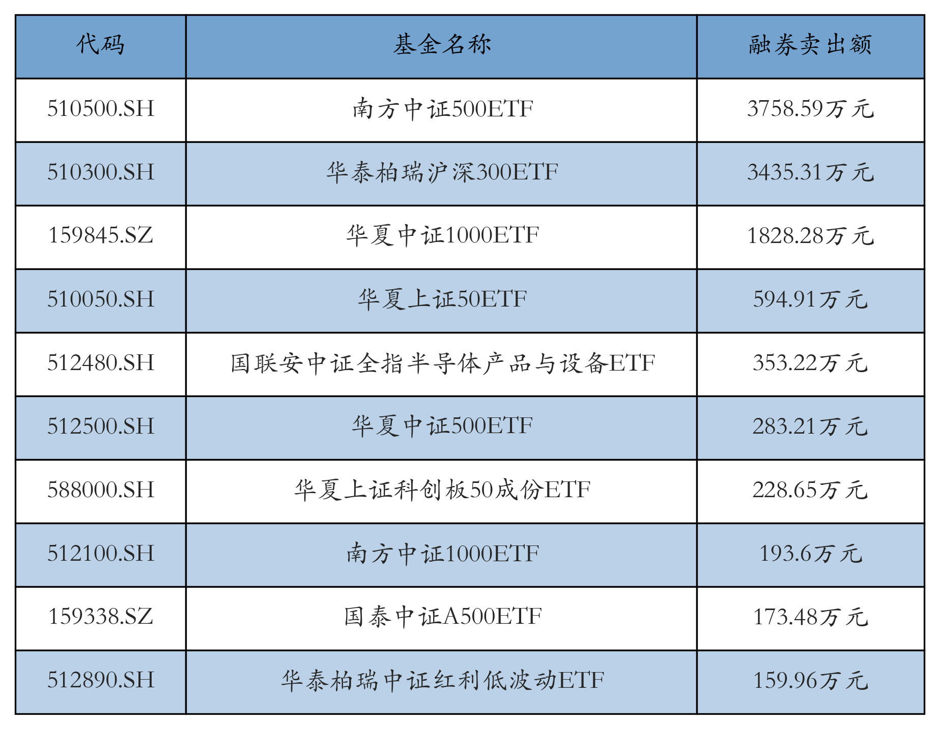 11月18日ETF融券卖出额前三位分别为:南方中证500ETF(3758.59万元)、华泰柏瑞沪深300ETF(3435.31万元)和华夏中证1000ETF(1828.28万元),前10具体见下表: