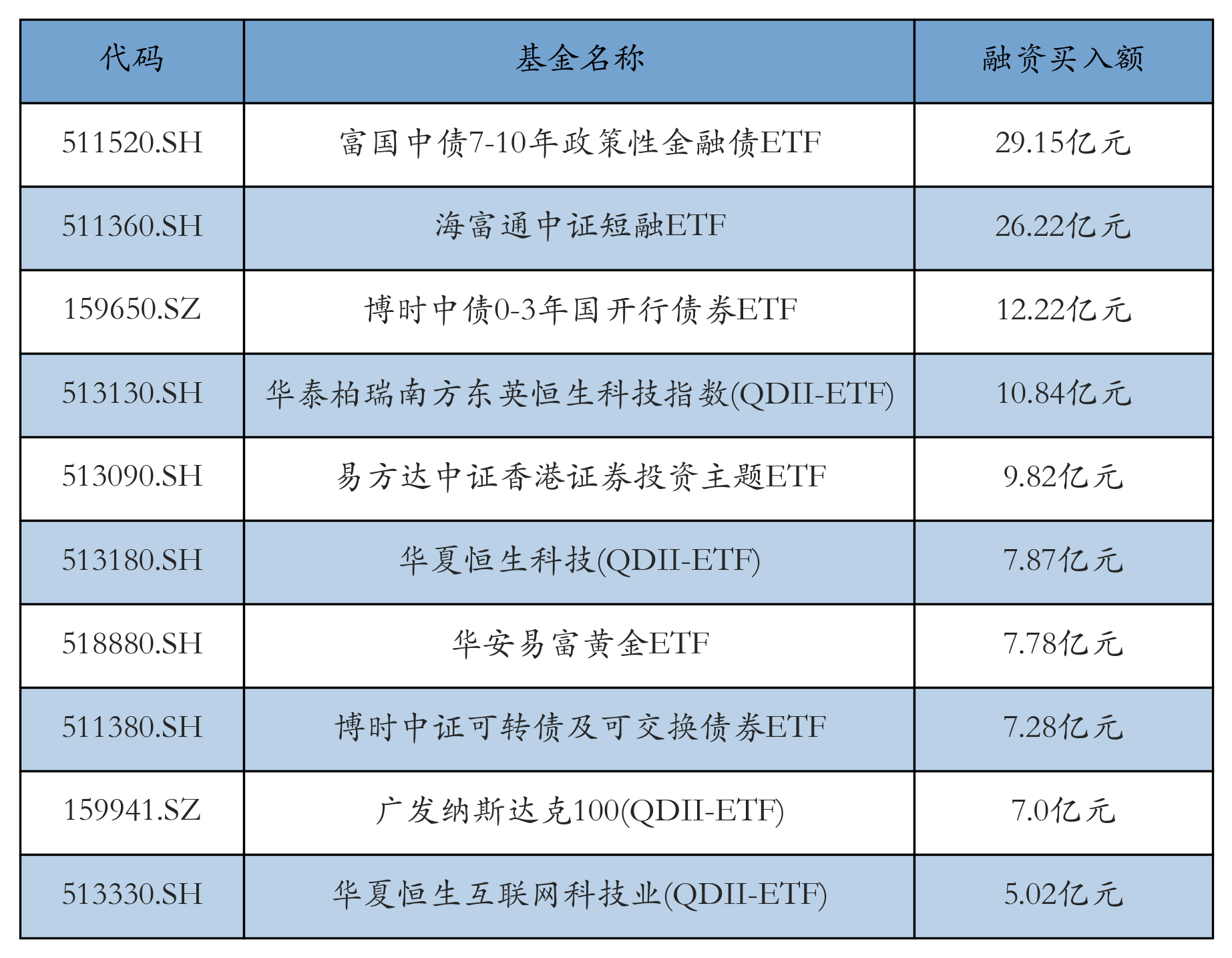 11月18日ETF融资买入额前三位分别为:富国中债7-10年政策性金融债ETF(29.15亿元)、海富通中证短融ETF(26.22亿元)和博时中债0-3年国开行债券ETF(12.22亿元),前10具体见下表: