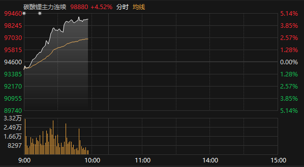 上证报中国证券网讯据Choice数据,11月19日早盘,碳酸锂期货主力合约持续走高,一度涨超5%,截至9:57报98880元/吨。