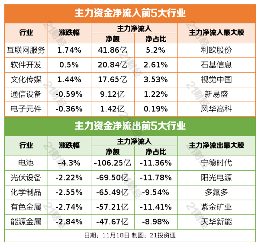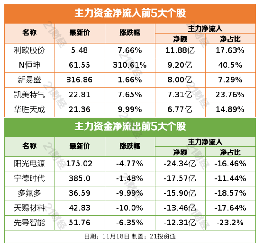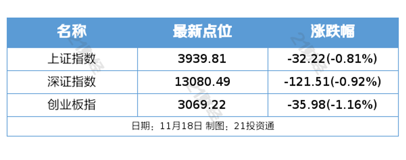 11月18日,市场全天震荡调整,三大指数低开低走,沪指、深成指盘中跌超1%。截至收盘,沪指跌0.81%,深成指跌0.92%,创业板指跌1.16%。沪深两市成交额1.93万亿元,较上一个交易日放量153亿元。