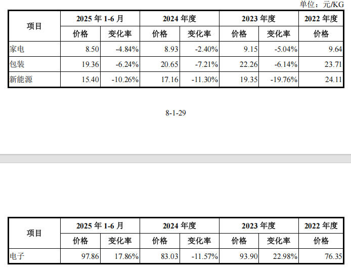 报告期内,公司主要产品的销售均价呈下降趋势。从公司披露的数据来看,各业务板块中,除电子材料业务外,其他主要业务板块的产品价格在报告期内均出现下降。