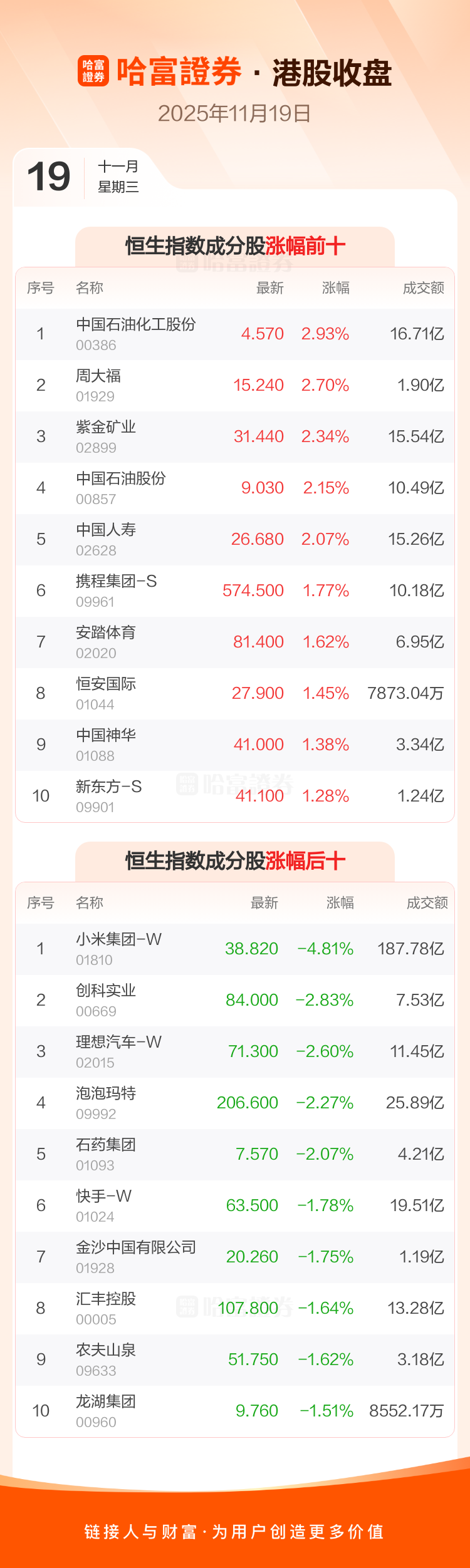 港股收盘:恒指跌0.38% 小米集团-W领跌成分股