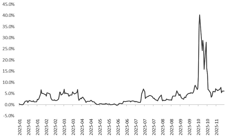 三季度末,白银现货紧俏。海外白银现货1个月期租赁利率三季度处于历年同期以来的高位,并在10月份以后加速上升,于10月10日达到阶段性高点40.3%。白银现货紧俏情况10月下旬有所缓解,截至11月17日,白银1个月期租赁利率回落至6.07%,但仍处于近年同期的相对高位。