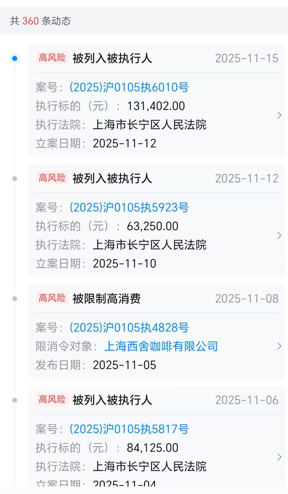 天眼查APP还显示,今年11月以来,西舍咖啡新增3条被执行人信息,被执行金额大约27.88万元。截至目前,该公司被执行总金额累计超过299万元,历史被执行人总金额累计超过1305万元;失信被执行人信息有10条,涉案金额超过412万元。