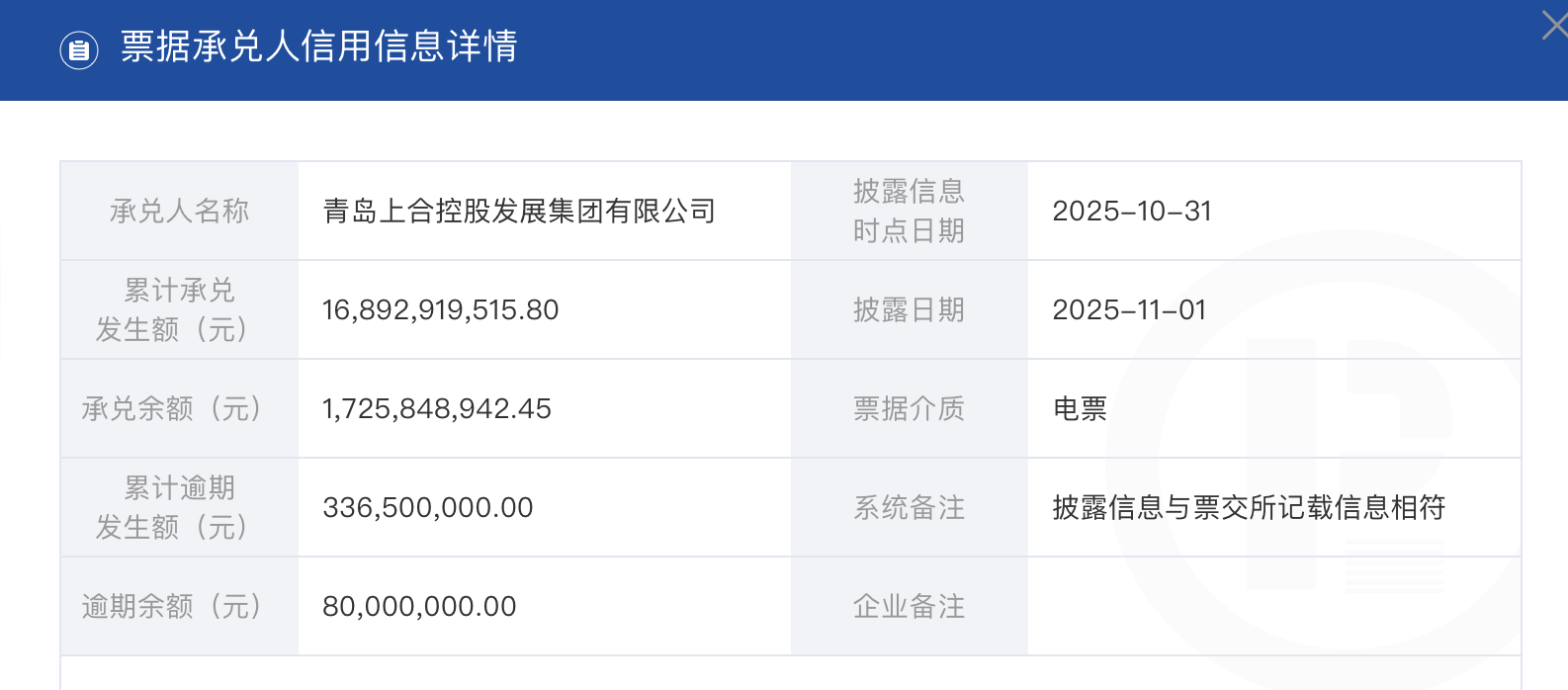 上海票据交易所近日公布的《截至2025年10月31日承兑人逾期名单》中,青岛上合控股发展集团有限公司(下称“上合控股集团”)首次出现,引发市场关注,截至2025年10月31日,该公司票据承兑逾期余额8000万元。