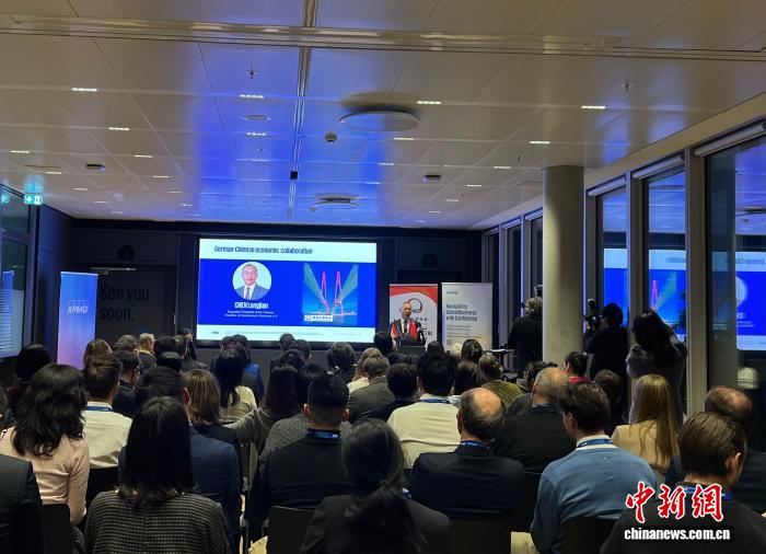 当地时间11月18日,德国中国商会(CHKD)联合毕马威会计师事务所在柏林发布《在德中资企业营商环境调查报告2025》。图为德国中国商会执行主席陈隆建发言。中新社记者马秀秀摄