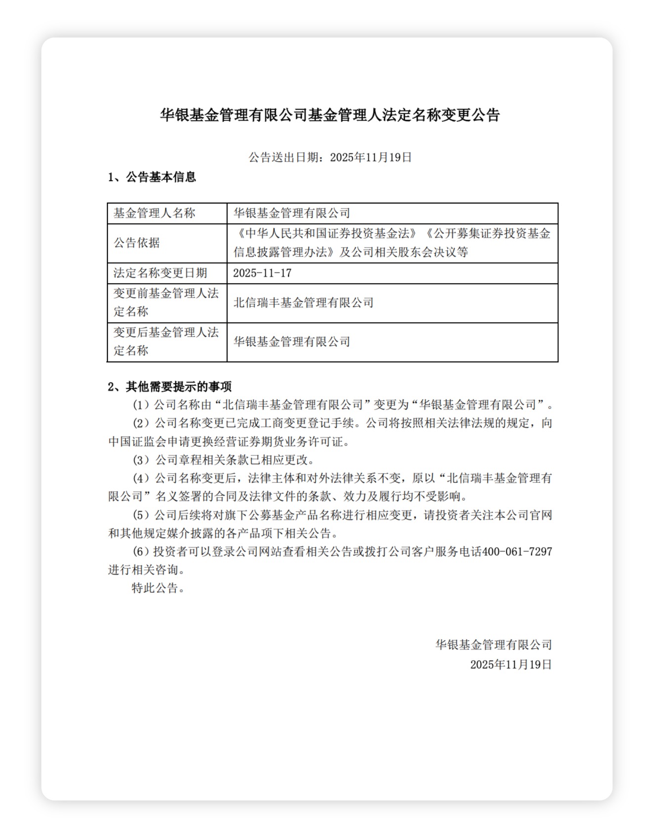 本报讯 (记者彭衍菘)11月19日,原北信瑞丰基金管理有限公司公告称,公司名称变更为“华银基金管理有限公司”(以下简称“华银基金”)。