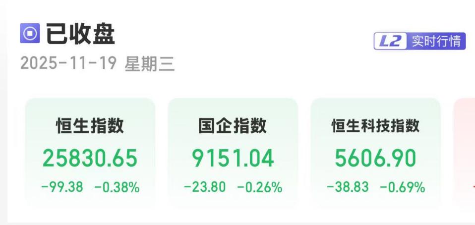 上证报中国证券网讯(卢伊记者严晓菲)11月19日,港股三大指数集体收跌。截至收盘,恒生指数跌0.38%,报25830.65点;恒生国企指数跌0.26%,报9151.04点;恒生科技指数跌0.69%,报5606.90点。