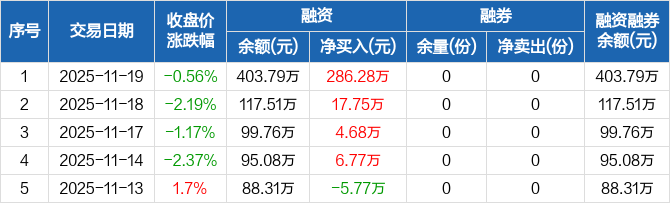 融资方面,当日融资买入296万元,融资偿还9.72万元,融资净买入286.28万元,连续4日净买入累计315.48万元。融券方面,融券卖出0份,融券偿还0份,融券余量0份,融券余额0元。融资融券余额合计403.79万元。