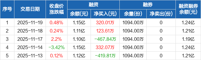 融资方面,当日融资买入2291.34万元,融资偿还1971.33万元,融资净买入320.01万元。融券方面,融券卖出0份,融券偿还0份,融券余量1094万份,融券余额921.15万元。融资融券余额合计1.24亿元。