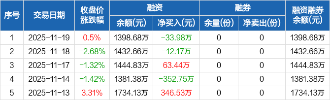 融资方面,当日融资买入225.18万元,融资偿还259.16万元,融资净偿还33.98万元。融券方面,融券卖出0份,融券偿还0份,融券余量0份,融券余额0元。融资融券余额合计1398.68万元。