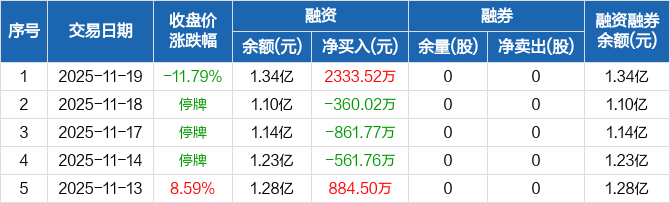 融资方面,当日融资买入4293.15万元,融资偿还1959.63万元,融资净买入2333.52万元,净买入额创12个月新高。融券方面,融券卖出0股,融券偿还0股,融券余量0股,融券余额0元。融资融券余额合计1.34亿元。