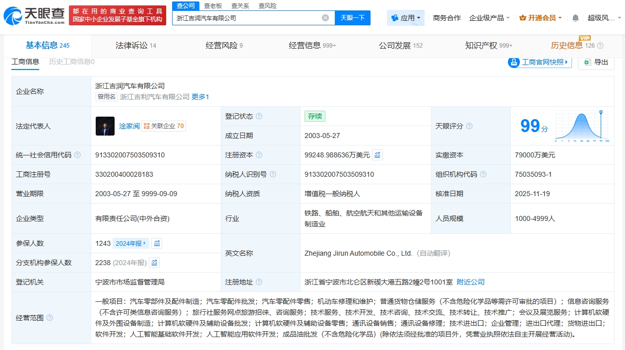 南方财经11月20日电,天眼查工商信息显示,近日,浙江吉润汽车有限公司发生工商变更,注册资本由约8.9亿美元增至约9.9亿美元,增幅约11.3%。该公司成立于2003年5月,法定代表人为淦家阅,经营范围包括汽车零部件及配件制造、汽车零配件批发、汽车零配件零售、机动车修理和维护等。股东信息显示,该公司由CenturionindustriesLimited、浙江吉利乘用车有限公司、浙江吉利汽车有限公司共同持股。