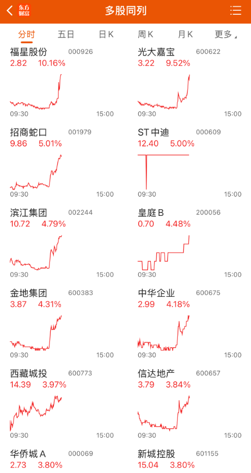 临近午盘,地产股突然集体拉升。房地产服务方面,我爱我家直线涨停,世联行亦成功封板,特发服务涨超10%;房地产开发方面,福星股份涨停,光大嘉宝大涨9.52%,招商蛇口涨5.01%,金地集团、中华企业、新城控股等多股跟涨。